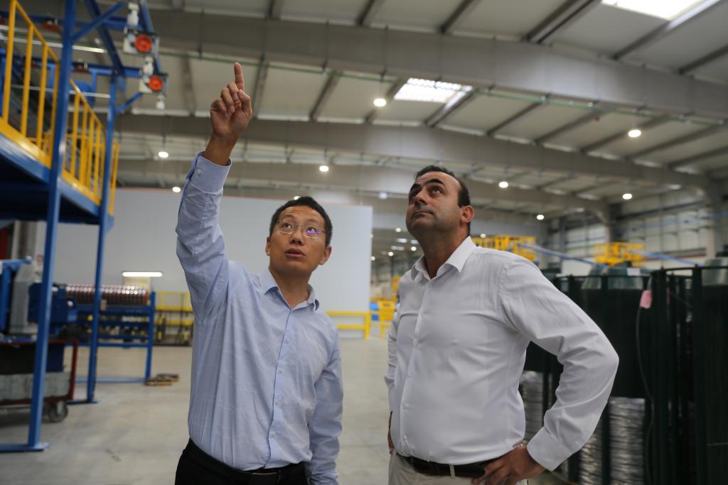 10月3日,在葡萄牙北部奧瓦爾市,亨通集團(tuán)駐葡萄牙的設(shè)備經(jīng)理劉建龍(左)與阿爾科夫雷電纜廠首席運(yùn)營官卡洛斯·格蘭雅討論技術(shù)問題。新華社記者荀偉攝