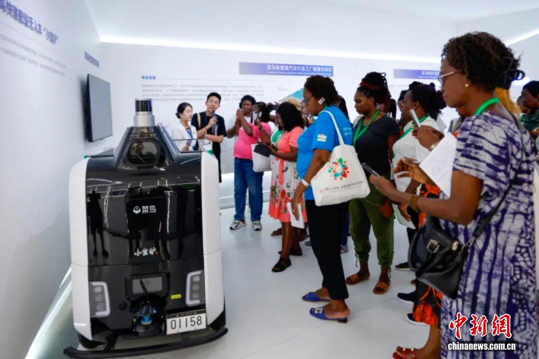 2025年9月16日,中非婦女官員能力建設(shè)研修班的25名學(xué)員來到杭州的中國(guó)人工智能小鎮(zhèn)。圖為研修班成員參觀快遞配送無人車。 中新社記者 肖健 攝