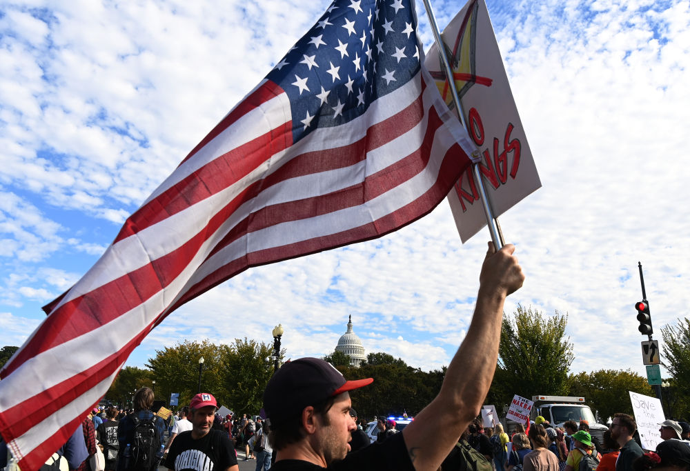 10月18日,在美國(guó)華盛頓,人們參加示威游行活動(dòng)。新華社記者李睿攝