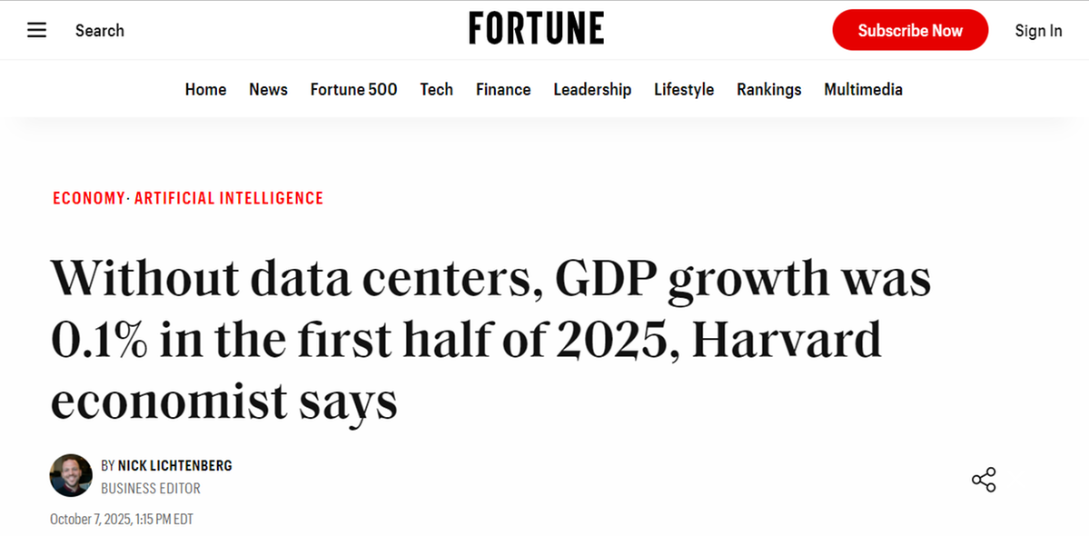 2025年上半年,美國(guó)GDP增長(zhǎng)幾乎全部依賴(lài)數(shù)據(jù)中心和AI投資,其中AI投資占比近92%。哈佛大學(xué)經(jīng)濟(jì)學(xué)家杰森·弗曼指出,若剔除這一領(lǐng)域,其余產(chǎn)業(yè)合計(jì)成長(zhǎng)率僅0.1%,幾乎陷入停滯。