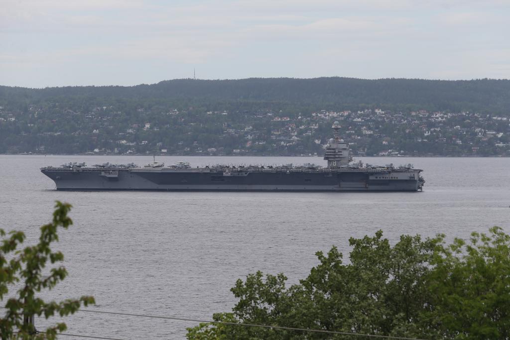 2023年5月24日,美國(guó)“杰拉爾德·R·福特”級(jí)航空母艦首艦“福特”號(hào)停靠在挪威首都奧斯陸的峽灣中。新華社記者張玉亮攝
