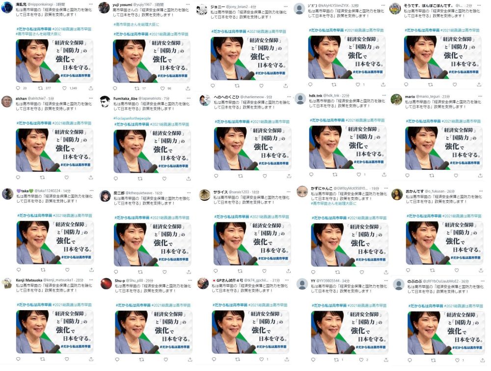 日本社交媒體平臺充斥如“當(dāng)然只能支持高市早苗”“高市早苗拜托了”等內(nèi)容相似的帖文。