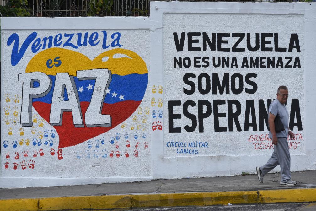 2025年9月22日,在委內(nèi)瑞拉首都加拉加斯,行人從街頭的宣傳標(biāo)語前走過。標(biāo)語上寫著“委內(nèi)瑞拉是和平國度”“委內(nèi)瑞拉不是威脅,而是希望”。新華社發(fā)(馬科斯·薩爾加多攝)