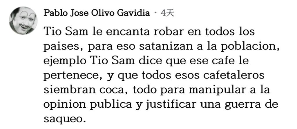 網(wǎng)友巴勃羅·奧利沃留言說:“山姆大叔喜歡在所有國家盜竊,為此他們妖魔化民眾,譬如山姆大叔說那片咖啡園是屬于他的,還說所有那些咖啡農(nóng)在種植古柯,所有這一切都是為了操弄輿論,為了給他們的掠奪戰(zhàn)爭辯護(hù)?!?/p>