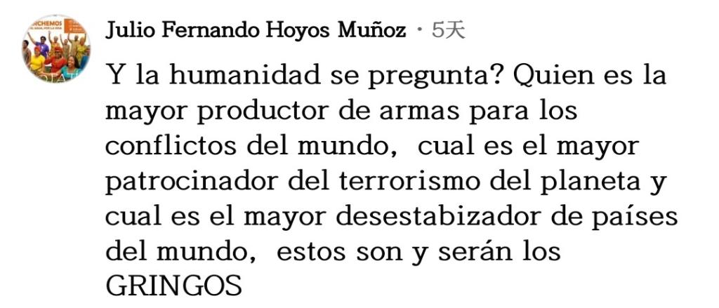 網(wǎng)友胡里奧·奧約斯接連發(fā)問:“沒有人去責(zé)問嗎?誰是為世界各地沖突提供武器的全球最大武器制造者?誰是地球上最大的恐怖主義活動支持者?誰是世界上最大的不穩(wěn)定因素制造者?答案無論在現(xiàn)在還是將來,都是美國?!?/p>