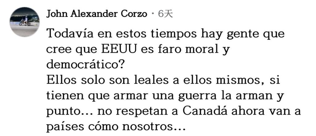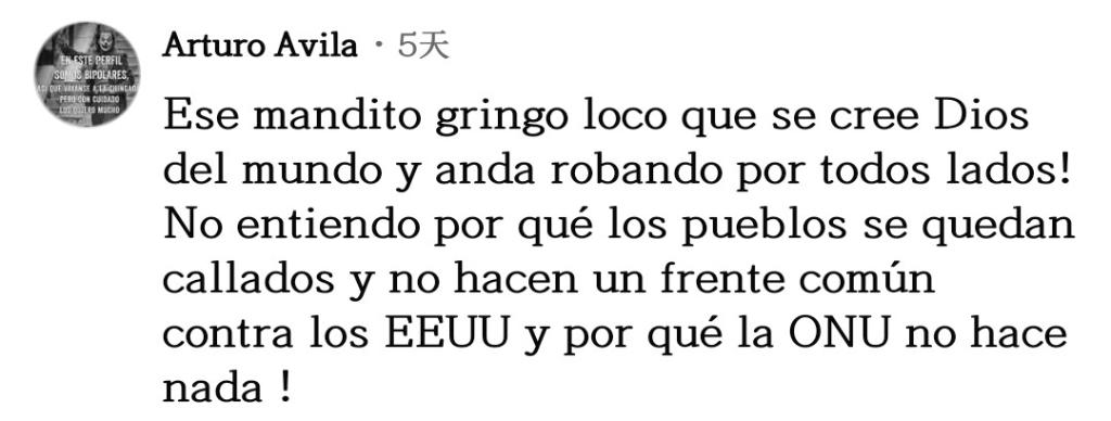 網(wǎng)友阿爾圖羅·阿維拉表達(dá)不解:“美國自以為是世界之神,到處掠奪!我不明白為什么各國人民依然保持沉默,而不是組成一個共同陣線對抗美國。”