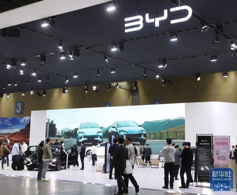 2025年4月8日,在韓國(guó)高陽舉行的 “2025首爾移動(dòng)出行展”上,觀眾參觀中國(guó)品牌比亞迪展區(qū)。
