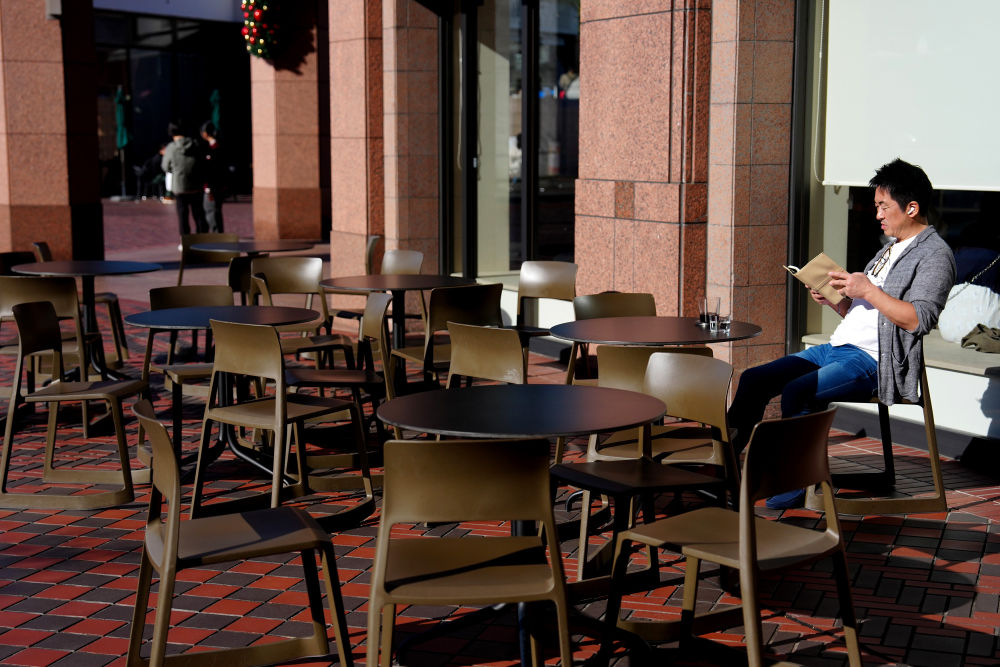 2025年11月17日,一名男子在日本東京的一家咖啡店外休憩。新華社記者賈浩成攝