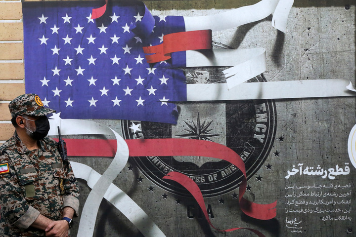 2025年11月4日,在伊朗首都德黑蘭舉行的集會(huì)上,安全人員站在反美宣傳畫前。當(dāng)天,伊朗多地民眾舉行集會(huì),譴責(zé)美國(guó)霸權(quán)和以色列的侵略行為。新華社發(fā)