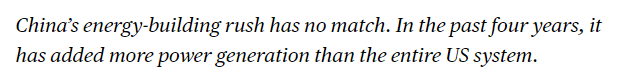文章說(shuō),中國(guó)的能源建設(shè)速度無(wú)與倫比。過(guò)去四年,中國(guó)新增的發(fā)電容量超過(guò)了整個(gè)美國(guó)電力系統(tǒng)的總和。這種大規(guī)模能源基礎(chǔ)設(shè)施投資幫助中國(guó)降低對(duì)化石燃料依賴,為人工智能數(shù)據(jù)中心等高耗能技術(shù)提供穩(wěn)定電力供應(yīng),從而在全球科技競(jìng)爭(zhēng)中獲得顯著優(yōu)勢(shì)。