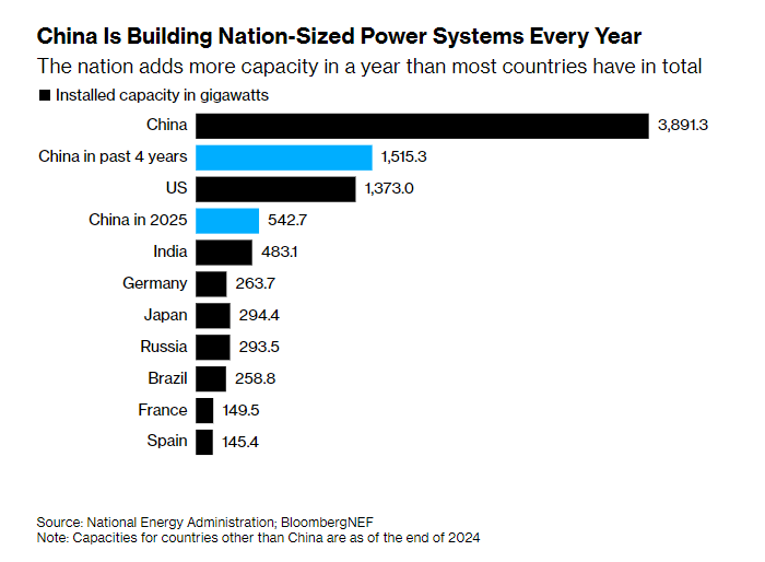 文章援引中國(guó)國(guó)家能源局日前公布的數(shù)據(jù),2025年,中國(guó)各類(lèi)技術(shù)新增發(fā)電裝機(jī)容量達(dá)到543吉瓦(GW)。這一數(shù)字比截至2024年底印度全國(guó)所有發(fā)電廠的總?cè)萘窟€要高出12%。自2021年底以來(lái),中國(guó)新增的發(fā)電容量也已超過(guò)整個(gè)美國(guó)電力系統(tǒng)的總量。