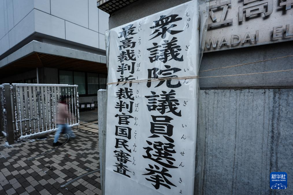 2月8日,在日本東京,工作人員在一處投票站外放置投票站標(biāo)志。新華社記者 賈浩成 攝