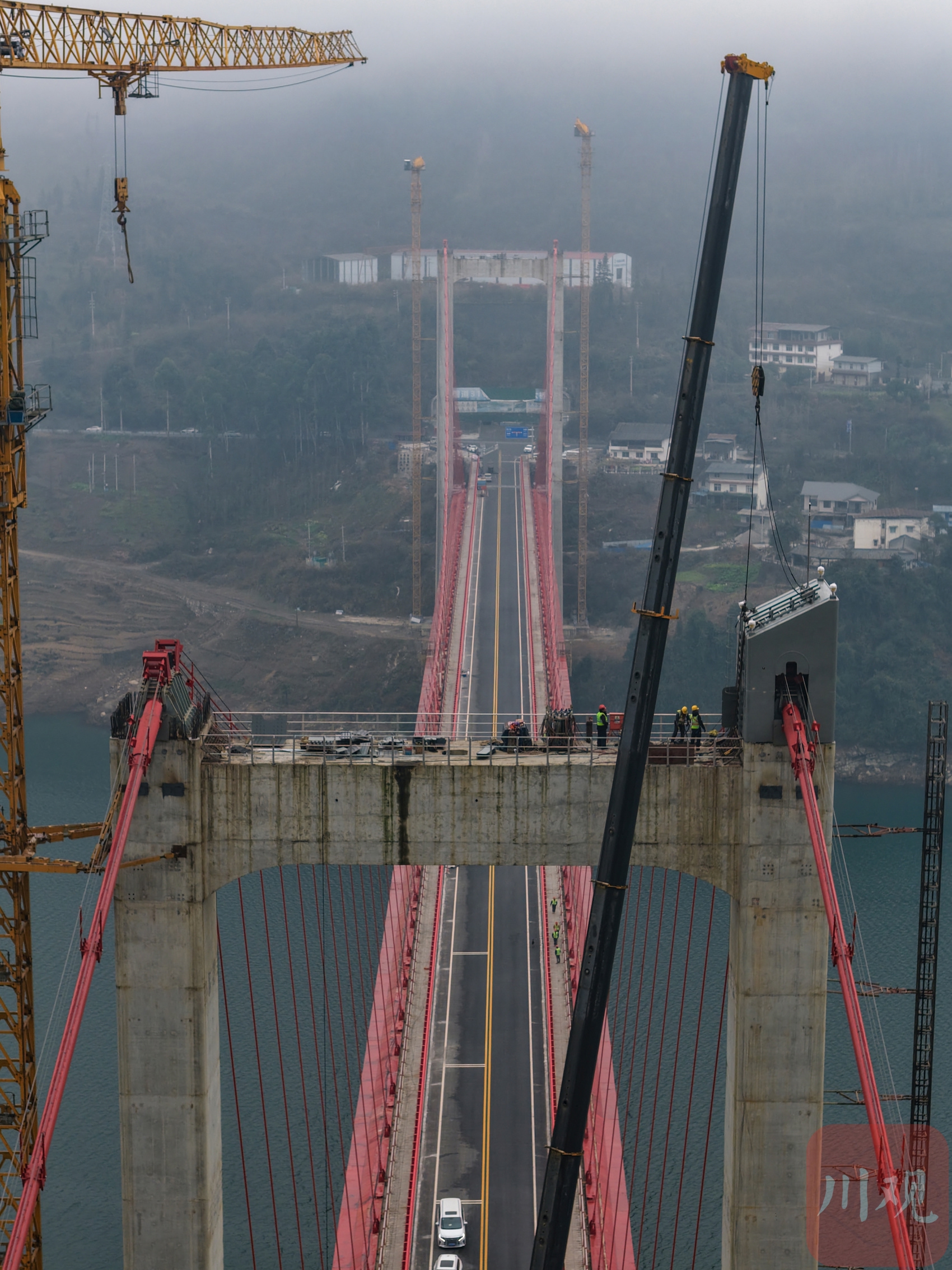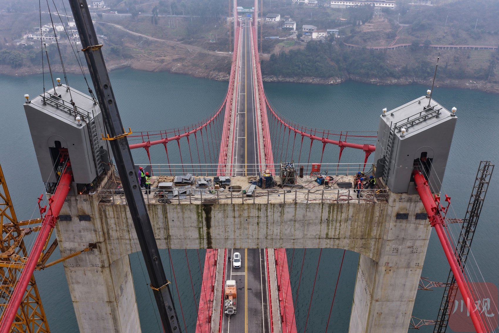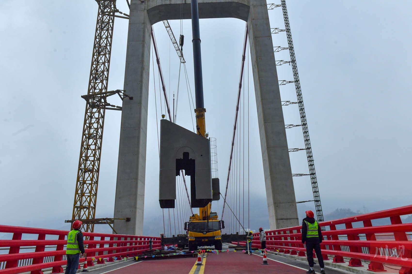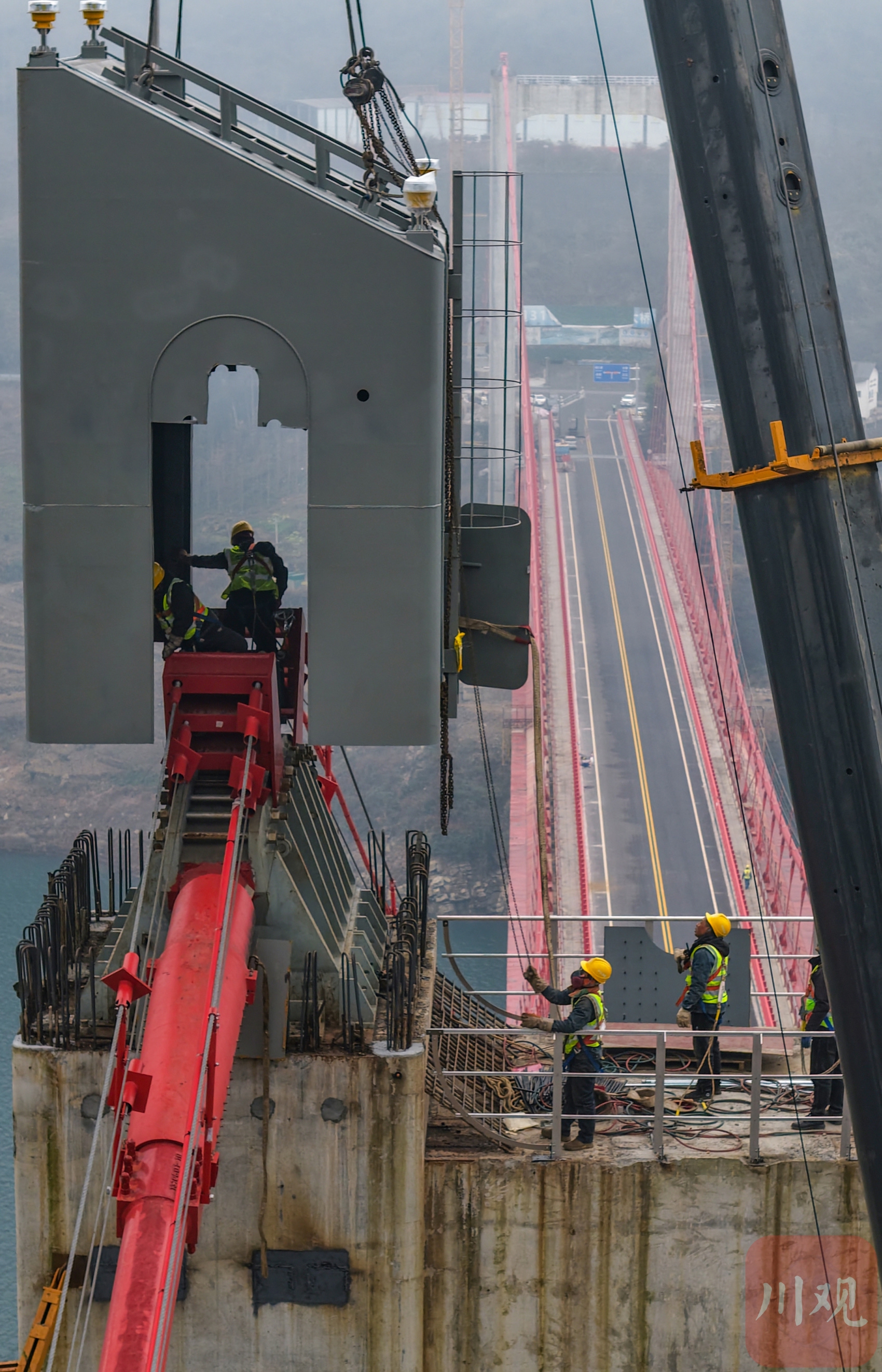 2026年1月19日,國道317線友誼隧道至汶川映秀段改建工程紫坪鋪特大橋施工現(xiàn)場,工人正在大橋主塔塔冠吊裝。