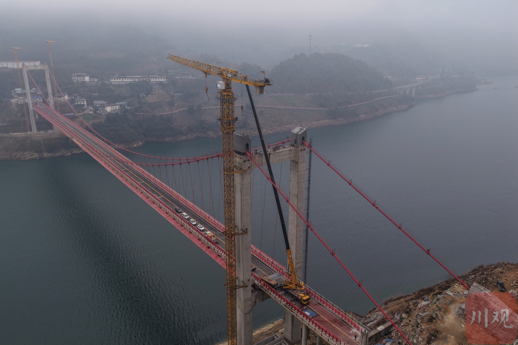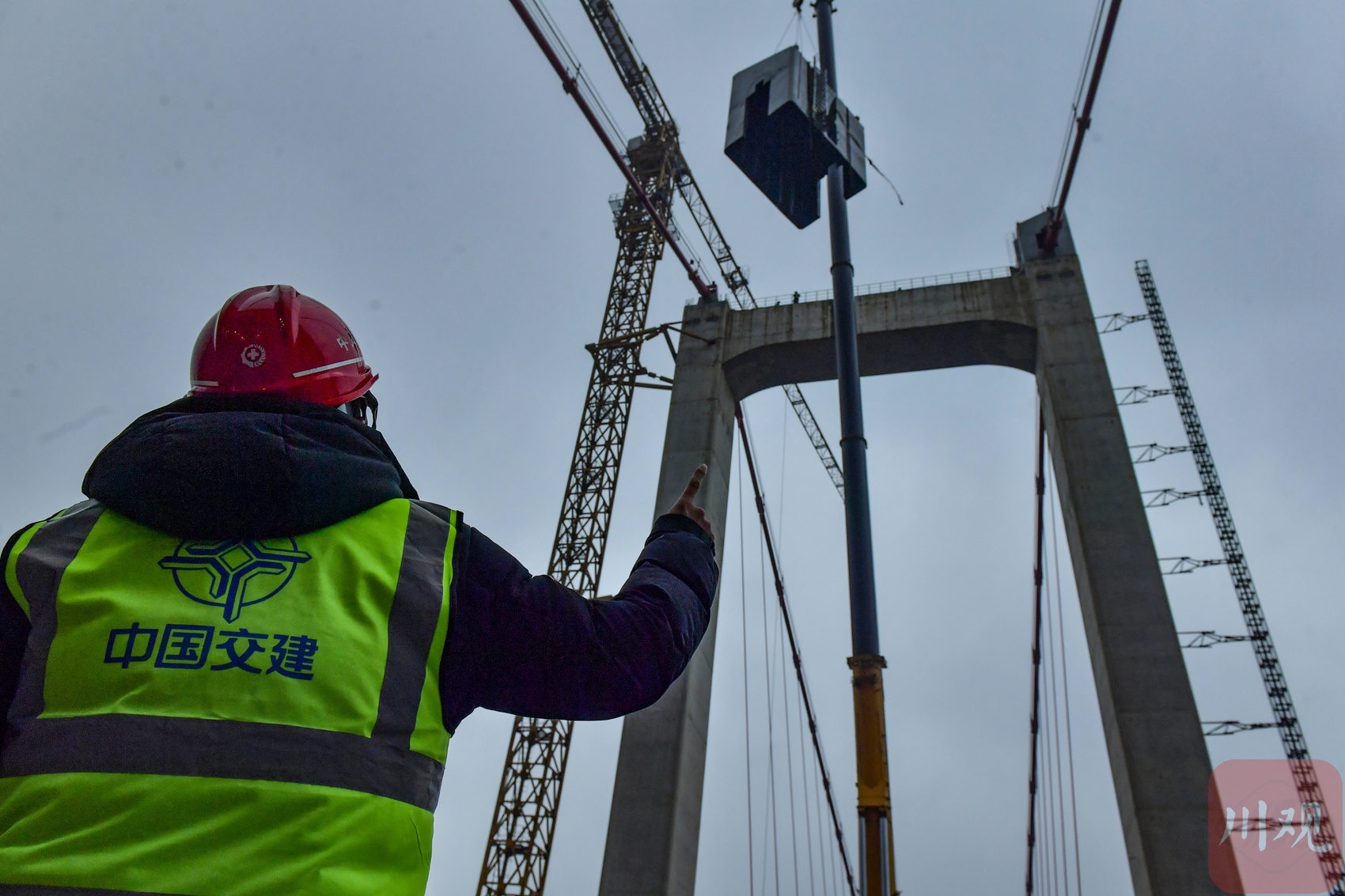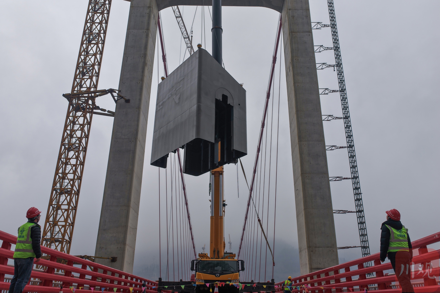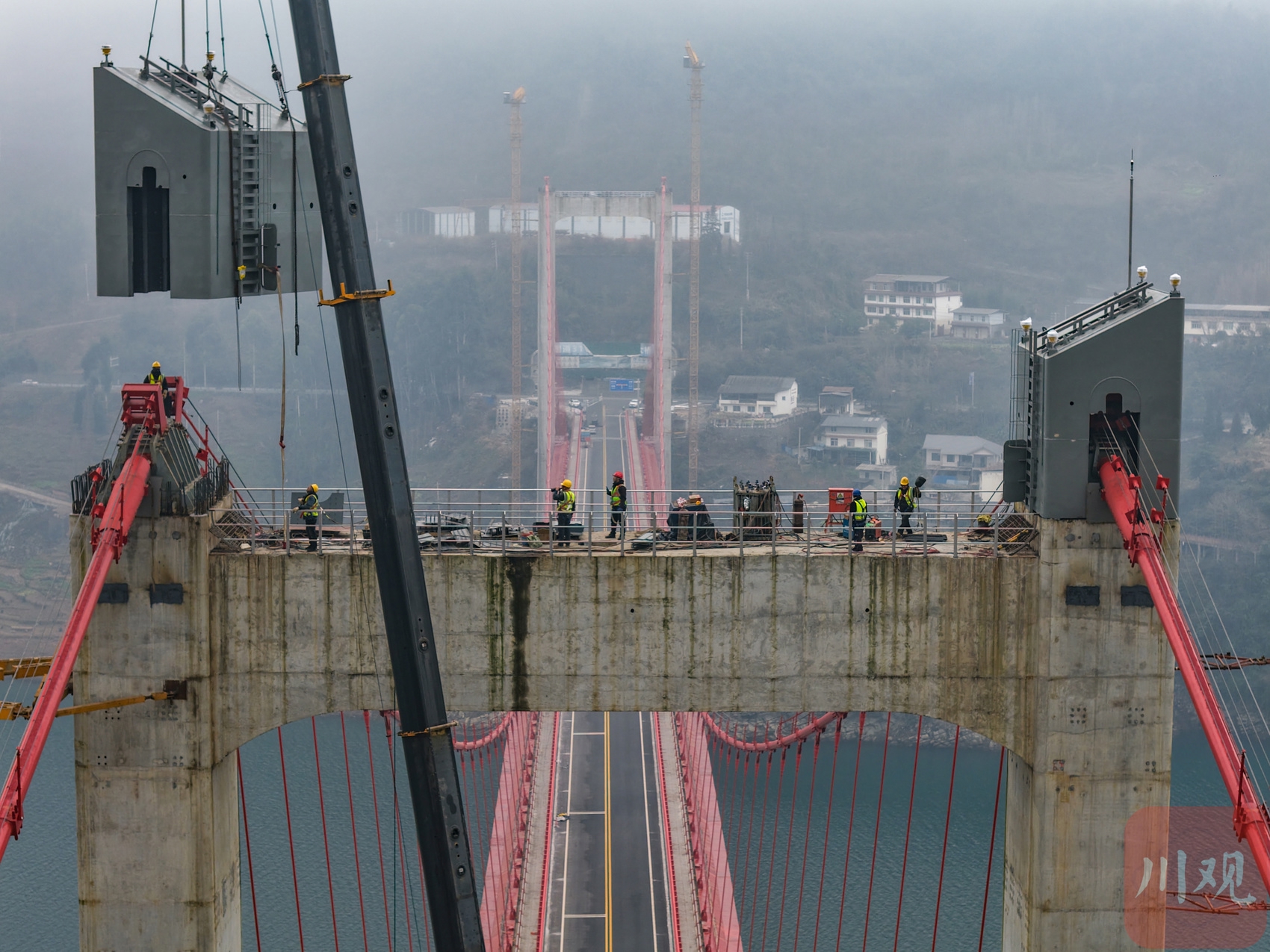 四川阿壩第一座懸索橋主塔塔冠完成安裝