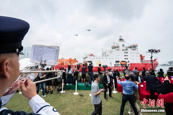 這次,香港更是以“海陸空”上陣歡迎“雪龍2”號(hào)到訪香港。在“雪龍2”號(hào)不遠(yuǎn)處,兩艘拖船和一艘消防船在碼頭附近對(duì)射水柱,形成水拱門(mén)。香港飛行服務(wù)隊(duì)的直升機(jī)飛過(guò)維多利亞港上空示意致敬,香港警察銀樂(lè)隊(duì)在現(xiàn)場(chǎng)奏樂(lè),九龍巴士車(chē)隊(duì)貼上歡迎“雪龍2”號(hào)標(biāo)志,還有舞獅隊(duì)歡迎“雪龍2”號(hào)來(lái)到香港。