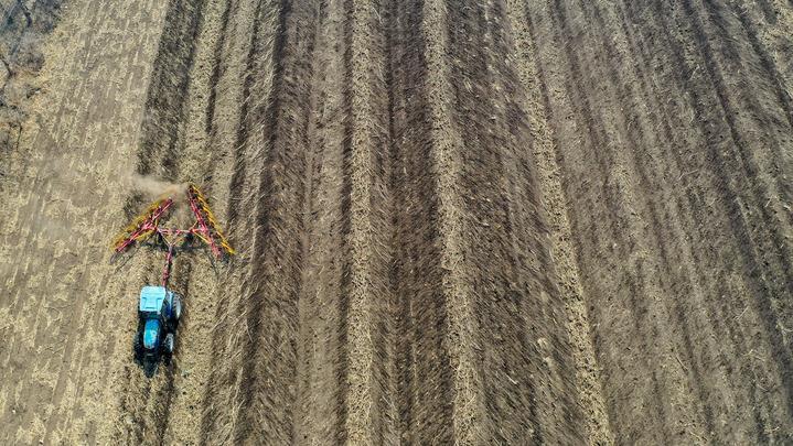 4月2日,在吉林省公主嶺市范家屯鎮(zhèn)乾程農(nóng)民專業(yè)合作社,農(nóng)民駕駛農(nóng)機(jī)整理耕地上的秸稈(無(wú)人機(jī)拍攝)。