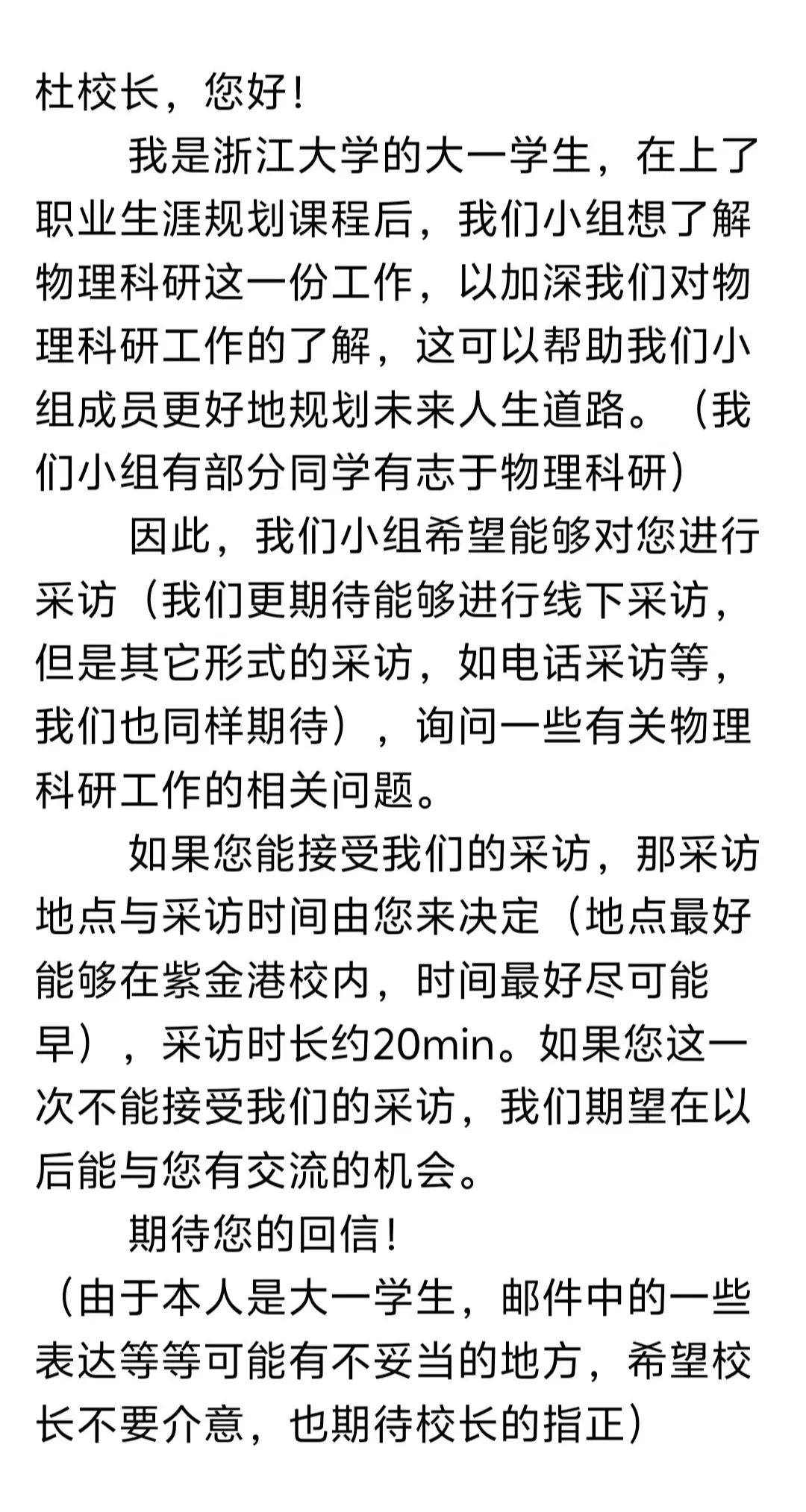 向校長(zhǎng)杜江峰發(fā)了一封郵件