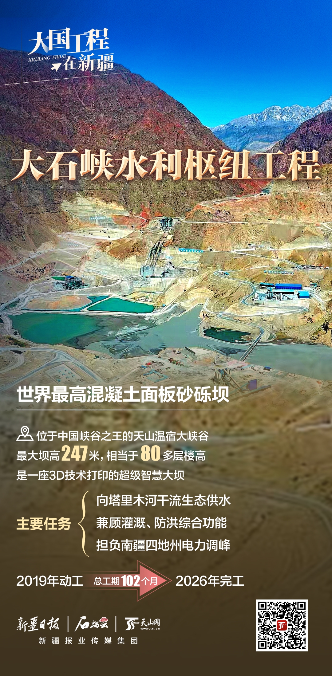 新疆大石峽水利樞紐工程建在號(hào)稱中國峽谷之王的天山溫宿大峽谷之中,攔河壩主壩為混凝土面板砂礫石壩,最大壩高247米,壩頂長度606米,比三峽大壩還高62米,是當(dāng)之無愧的天塹工程。
