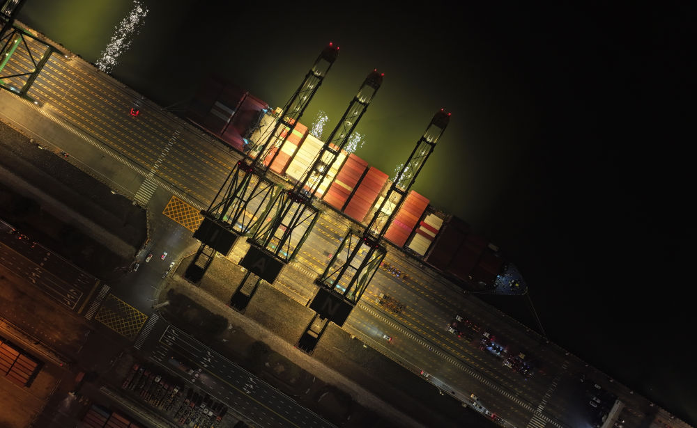 2024年1月16日,大型集裝箱班輪“巴赫”號靠泊在天津港太平洋國際集裝箱碼頭(無人機照片)。新華社記者 趙子碩 攝