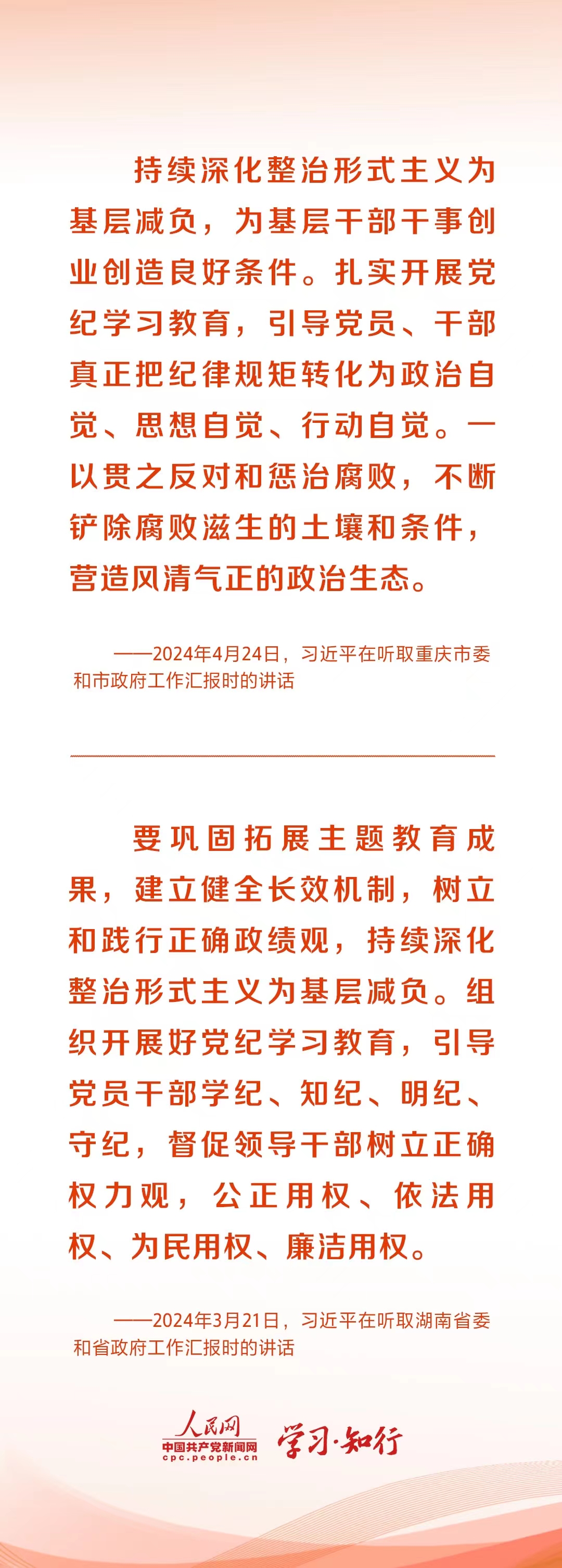 在新時(shí)代推動(dòng)西部大開(kāi)發(fā)座談會(huì)上,習(xí)近平再次明確,“鞏固拓展主題教育成果,抓好黨紀(jì)學(xué)習(xí)教育,持續(xù)整治形式主義為基層減負(fù)?!?/p>