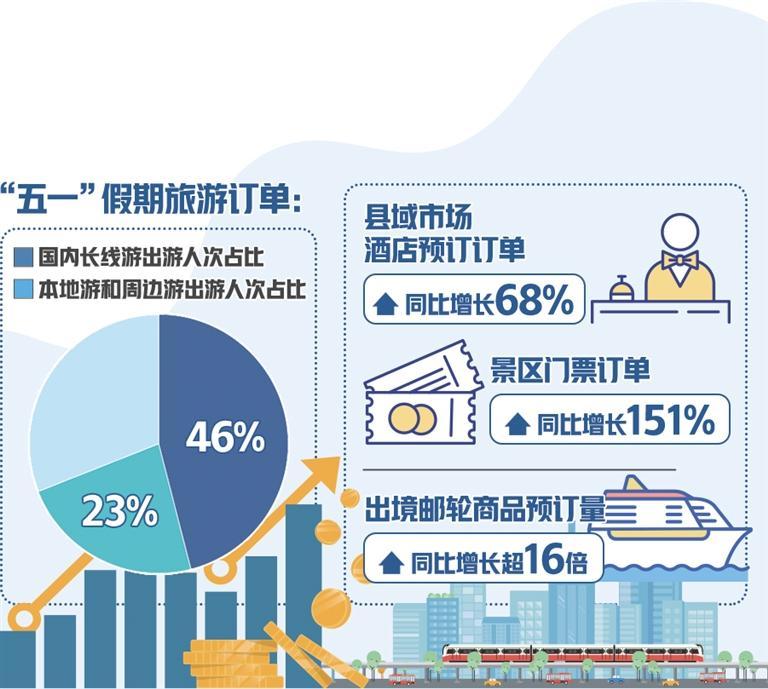 從出游目的地看,北京、上海、重慶、杭州、成都、南京、西安、武漢、廣州等城市是熱門,帶動(dòng)相關(guān)交通和酒店訂單量走高。去哪兒旅行網(wǎng)顯示,北京—上海、成都—西安、上?!錆h、深圳—長(zhǎng)沙、北京—青島等熱門線路的火車票預(yù)約購(gòu)票難度不低于春運(yùn);從上海、北京、深圳、廣州、杭州、南京等地出發(fā),飛往旅游城市的機(jī)票平均支付價(jià)格走高,北京—成都、上?!ッ鞯葻衢T航線的部分航班已升至全價(jià);在攜程旅行網(wǎng)上,天水、徐州、淄博、合肥、南昌、迪慶、煙臺(tái)等城市的“五一”假期酒店預(yù)訂增速明顯;四線及以下城市,尤其是縣域旅游市場(chǎng)帶來(lái)新增量,縣域市場(chǎng)酒店預(yù)訂訂單同比增長(zhǎng)68%、景區(qū)門票訂單同比增長(zhǎng)151%。