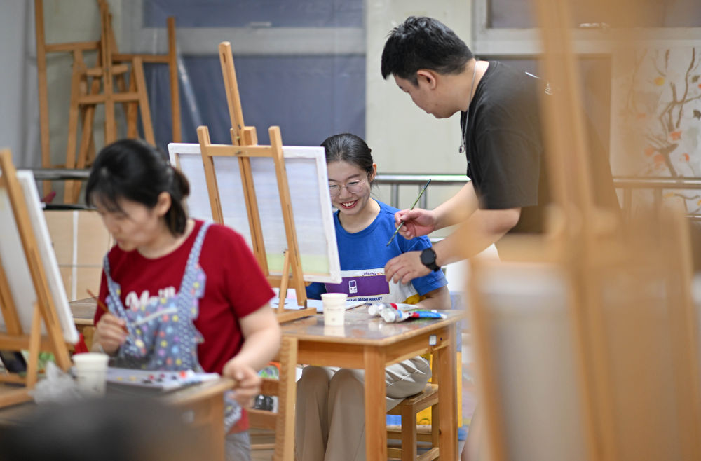 ↑4月26日,在天津青年宮,青年夜校教師陸圣指導(dǎo)學(xué)員呂昕蕾學(xué)習(xí)油畫(huà)。