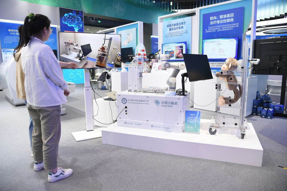 這是2024年4月27日在中關(guān)村展示中心常設(shè)展中拍攝的“北腦二號(hào)”腦機(jī)接口。