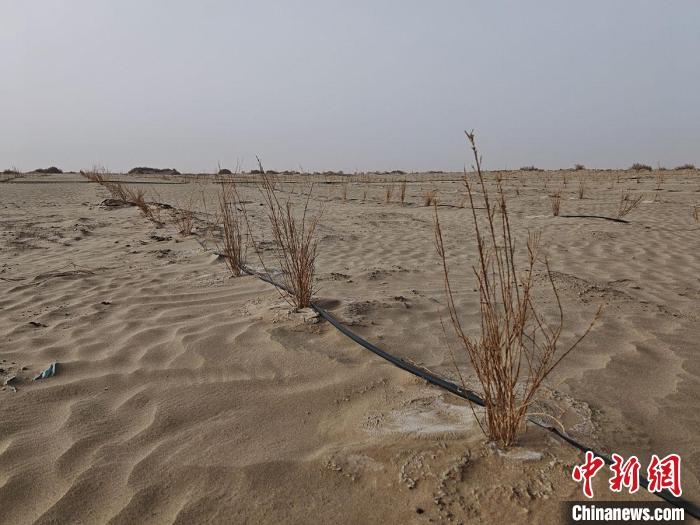 中電建25萬千瓦光伏基地外圍種植的梭梭樹。(馬海驕 攝)