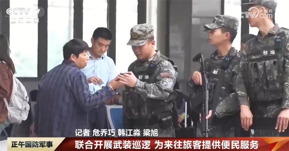在安徽蚌埠火車站,武警官兵與公安特警聯(lián)合開展武裝巡邏,主動加大對重點(diǎn)區(qū)域的實(shí)時(shí)監(jiān)控和巡邏力度,在維護(hù)秩序的同時(shí),官兵還耐心為廣大旅客答疑解惑,提供便民服務(wù)。