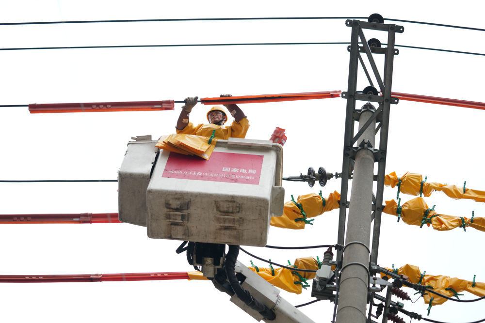 4月24日,賀彪在湖南省長(zhǎng)沙市岳麓區(qū)一小區(qū)開展帶電作業(yè)。新華社記者 薛宇舸 攝