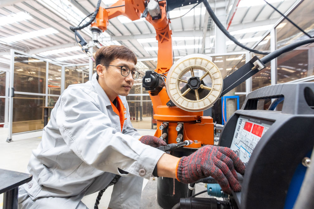 4月23日,在浙江錢江機(jī)器人有限公司車間,王洋在調(diào)整電焊機(jī)的參數(shù)。新華社發(fā)(溫嶺市委宣傳部供圖)