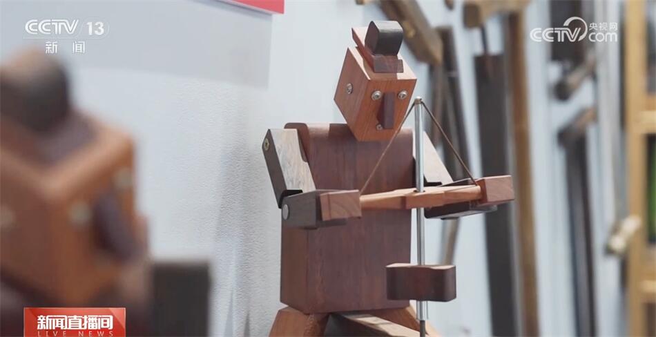 山東省非物質(zhì)文化遺產(chǎn)“橋氏木作”技藝傳承人喬一兵在工作站里也有自己的工作室,他用一整塊木料,不用一釘一鉚,制作魯班枕結(jié)構的系列用品。