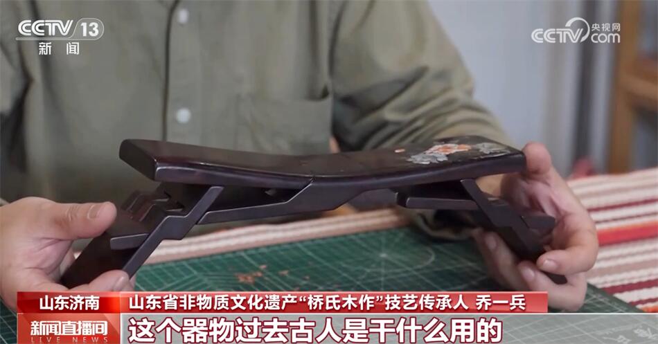 山東省非物質(zhì)文化遺產(chǎn)“橋氏木作”技藝傳承人喬一兵介紹:“它本身是一整塊木頭六個面,通過鋸和鑿形成一個器物。這個器物過去古人是干什么用的?當枕頭用的,也可以當?shù)首佑茫畲蟮奶攸c是可以折疊,攜帶非常方便,傳說是魯班發(fā)明的。和眾多的優(yōu)秀的傳統(tǒng)技藝一樣,它深層次代表的是中國的一些思想、一些哲學、一些文化在里邊,魯班枕的核心是平衡和和諧,我覺得我很有必要把它傳承下來,發(fā)揚光大。”