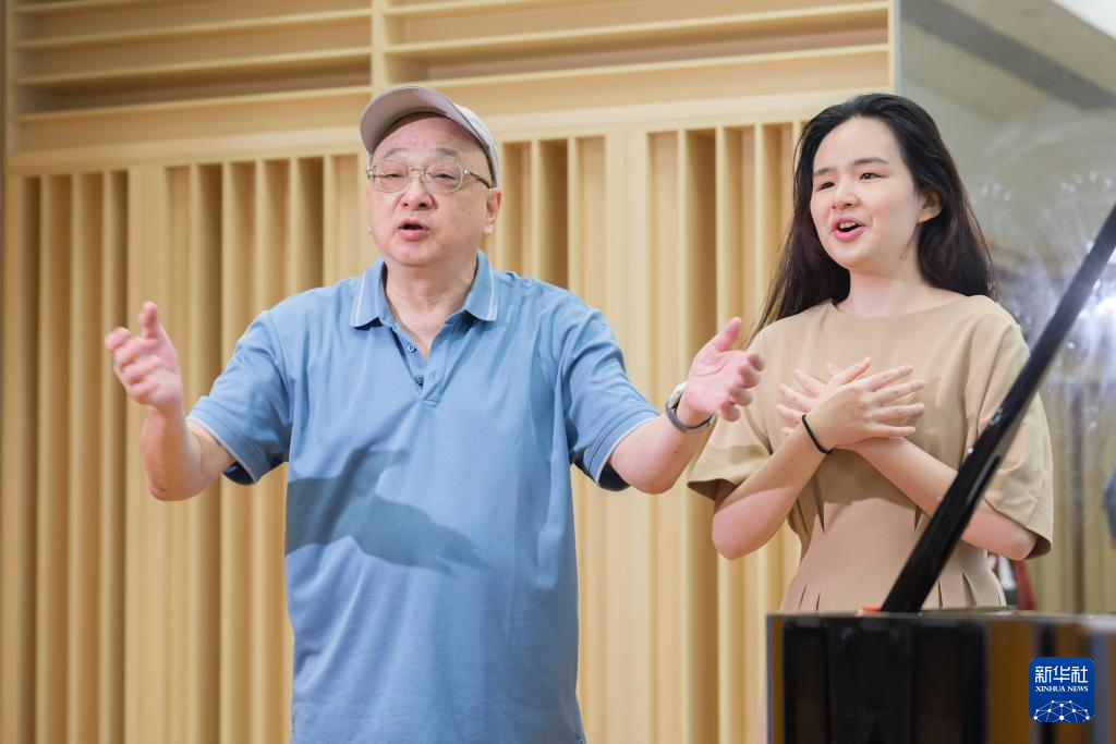 4月22日,蕭輝德(左)幫助蕭凱恩排練。新華社記者 朱煒 攝