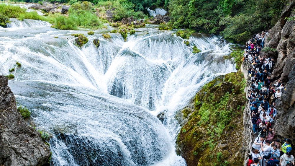 5月2日,游客在貴州省安順市天星橋景區(qū)游覽(無人機照片)。新華社發(fā)(陳熙 攝)