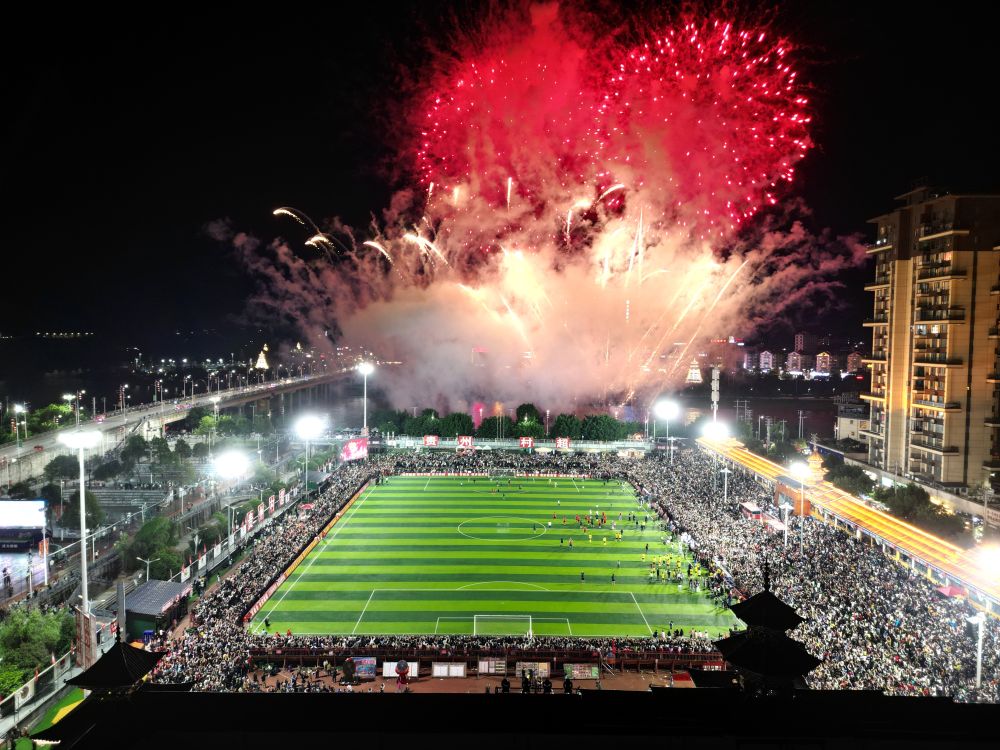 5月4日,游客在貴州省黔東南苗族侗族自治州榕江縣“村超”球場比賽結(jié)束后欣賞焰火表演(無人機照片)。新華社發(fā)(王炳真 攝)