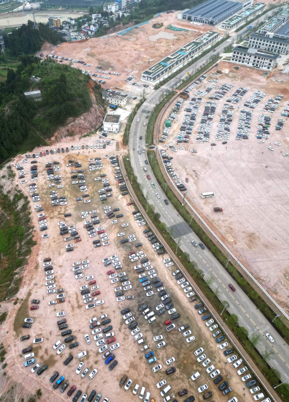 5月1日,游客車輛在貴州省黔東南苗族侗族自治州臺江縣臺盤村停車(無人機照片)。為了滿足外地游客觀看“村BA”的需求,當(dāng)?shù)乩瞄e置空地規(guī)劃設(shè)置免費臨時停車場,增加車位7000余個,供游客免費停車。新華社發(fā)(余天英 攝)