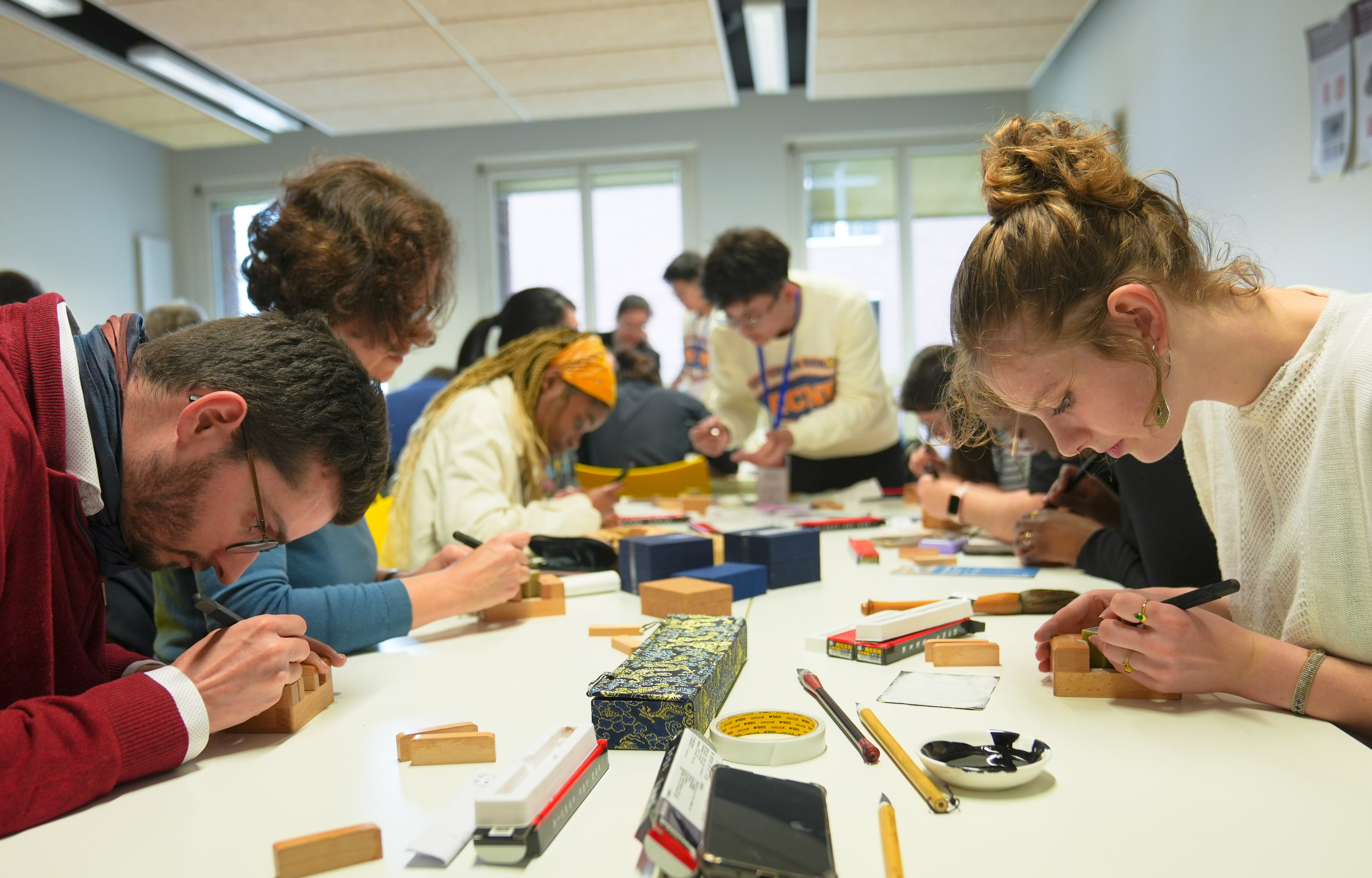 當(dāng)?shù)貢r間5月2日,在巴黎東方語言文化學(xué)院內(nèi),華東師大美術(shù)學(xué)院崔樹強(qiáng)教授與教育部中華優(yōu)秀傳統(tǒng)文化篆刻傳承基地主任張索教授、顧琴教授帶領(lǐng)書法篆刻碩士研究生杜家航、程羽瑄、蔡崢指導(dǎo)巴黎東方語言文化學(xué)院師生進(jìn)行書印體驗。