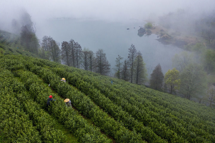 2024年4月7日,在位于浙江省金華市金華山鹿田村的婺州舉巖茶基地,茶農(nóng)在采摘舉巖茶鮮葉,發(fā)展特色茶產(chǎn)業(yè)是推動(dòng)當(dāng)?shù)匕傩展哺坏闹匾緩街唬o人機(jī)照片)。新華社記者 徐昱 攝