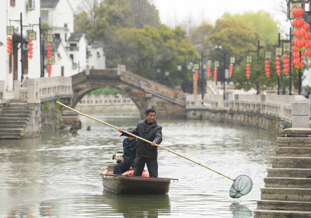 2023年3月16日,在太湖畔的浙江省湖州市織里鎮(zhèn)義皋村,保潔員在清理河道。多年來的溇港整治使得太湖周邊河道水質(zhì)明顯改善,也為鄉(xiāng)村旅游注入動(dòng)力。新華社記者 翁忻旸 攝