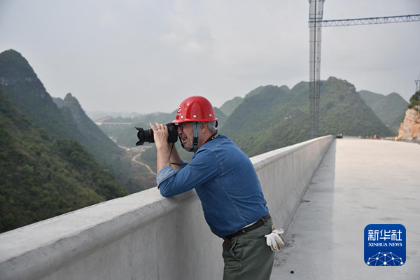 法國攝影師格雷瓜爾·戴高樂在花江峽谷大橋施工現場拍攝(4月27日攝)。新華社記者 駱飛 攝