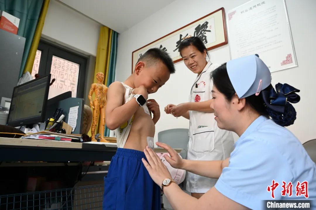 2023年7月11日,入伏首日,在內(nèi)蒙古呼和浩特市一醫(yī)院內(nèi),醫(yī)護(hù)人員為小朋友貼“三伏貼”?!叭N”是一種傳統(tǒng)的冬病夏治療法。劉文華 攝
