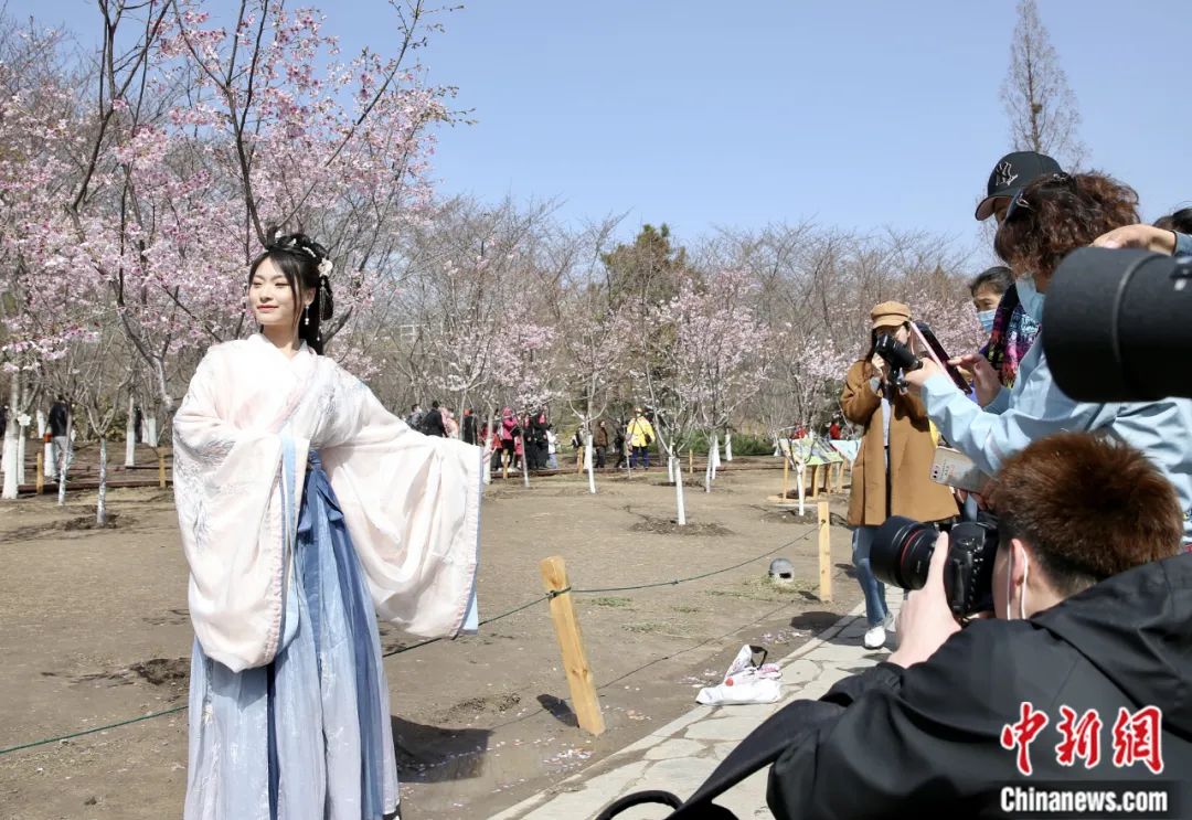 2021年北京玉淵潭公園春季賞花文化活動(dòng)在春分節(jié)氣開幕,一名穿漢服的游客在櫻花樹前拍照。易海菲 攝