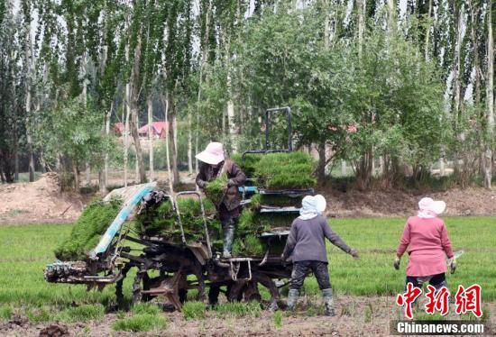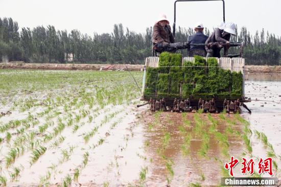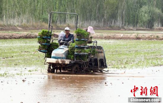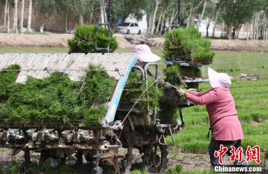 5月13日,在位于該市帕哈太克里鄉(xiāng)的“海水稻”種植基地,各類機械和工作人員都忙碌起來,搶抓農(nóng)時進行“海水稻”播種工作。隨著氣溫回升,新疆喀什市的1.3萬畝“海水稻”進入插秧期。圖為工作人員駕駛著插秧機,搶抓農(nóng)時進行“海水稻”播種工作。