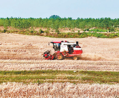 一片金黃的麥田里,撥禾輪轉(zhuǎn)動,麥芒飛揚,麥粒傾瀉而下……就在23日,蔡華從早忙到晚,沒敢停歇:“預(yù)報有雨,我得趕緊把客戶家的80多畝地收完?!碧烊谙聛?,他才把收割機停進車棚,麥香味瞬間涌進小院。累了一整天,剛吃完飯,蔡華又和妻子張秀蘭盤算起出發(fā)的行頭:對講機、收款二維碼……