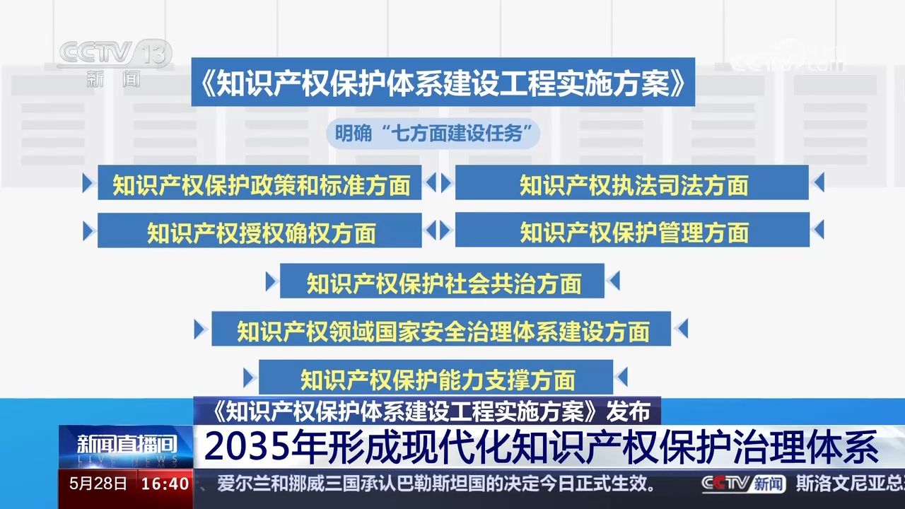 國(guó)家知識(shí)產(chǎn)權(quán)局5月28日舉行新聞發(fā)布會(huì),重點(diǎn)介紹《知識(shí)產(chǎn)權(quán)保護(hù)體系建設(shè)工程實(shí)施方案》(以下簡(jiǎn)稱《方案》)有關(guān)情況?!斗桨浮访鞔_,到2035年,知識(shí)產(chǎn)權(quán)保護(hù)體系和保護(hù)能力現(xiàn)代化基本實(shí)現(xiàn),形成政府履職盡責(zé)、執(zhí)法部門嚴(yán)格監(jiān)管、司法機(jī)關(guān)公正司法、經(jīng)營(yíng)主體規(guī)范管理、行業(yè)組織自律自治、社會(huì)公眾誠(chéng)信守法的現(xiàn)代化知識(shí)產(chǎn)權(quán)保護(hù)治理體系。