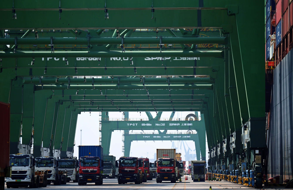 5月29日,卡車在天津港太平洋國際集裝箱碼頭運(yùn)輸集裝箱。新華社發(fā)