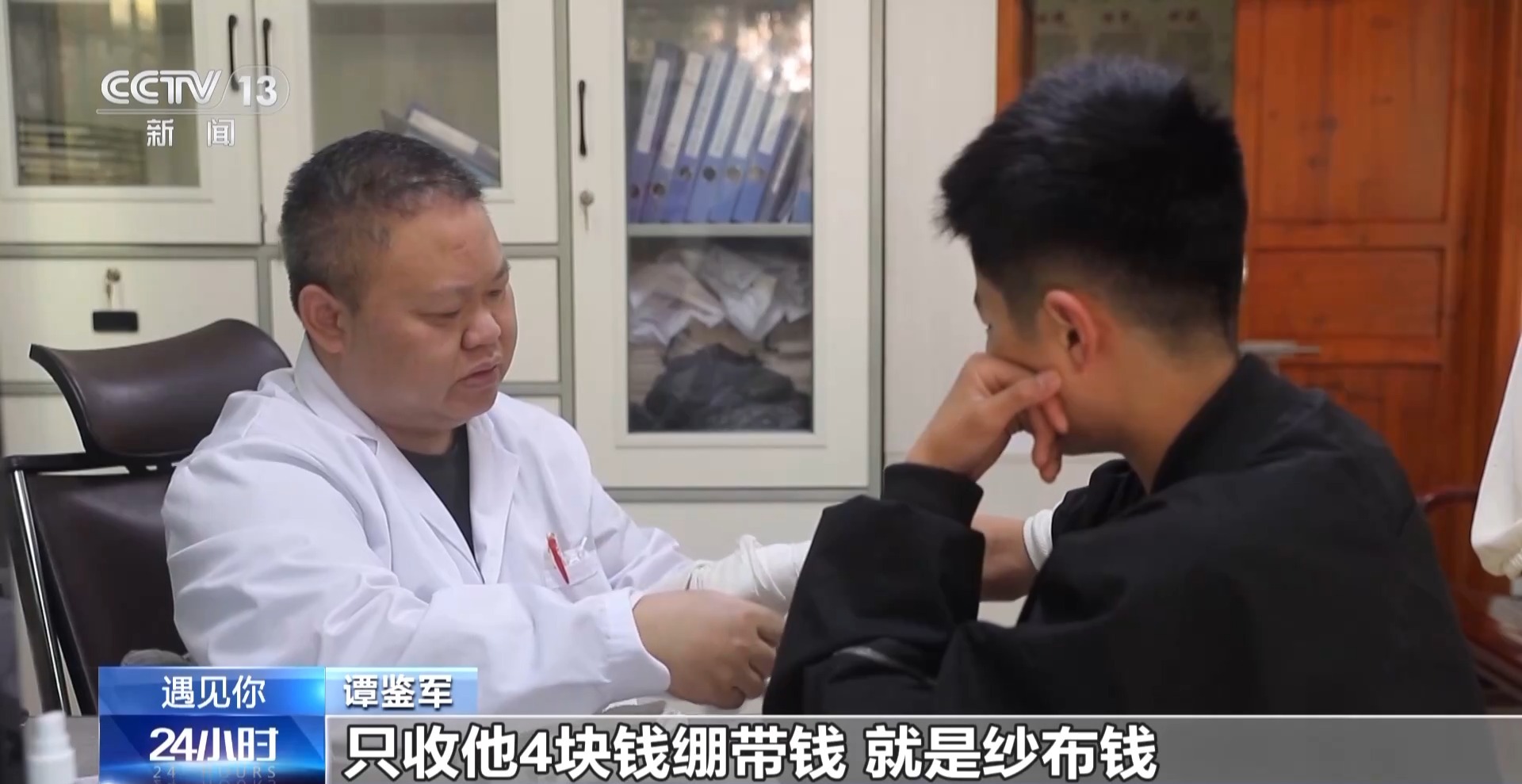 譚鑒軍:這個(gè)小段,我剛剛給他檢查了,只收他4塊錢紗布錢。學(xué)生脫臼、骨折、腳崴,我們會(huì)給他進(jìn)行手法復(fù)位,但是我們從來不收錢,還有小學(xué)、幼兒園的學(xué)生很喜歡玩彈珠,塞到鼻子上,我們每次取完也不收錢的。