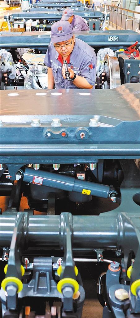 ?5月28日,中車長客轉向架事業(yè)部總成產(chǎn)線組,一臺臺轉向架排列在數(shù)字化智能產(chǎn)線上。