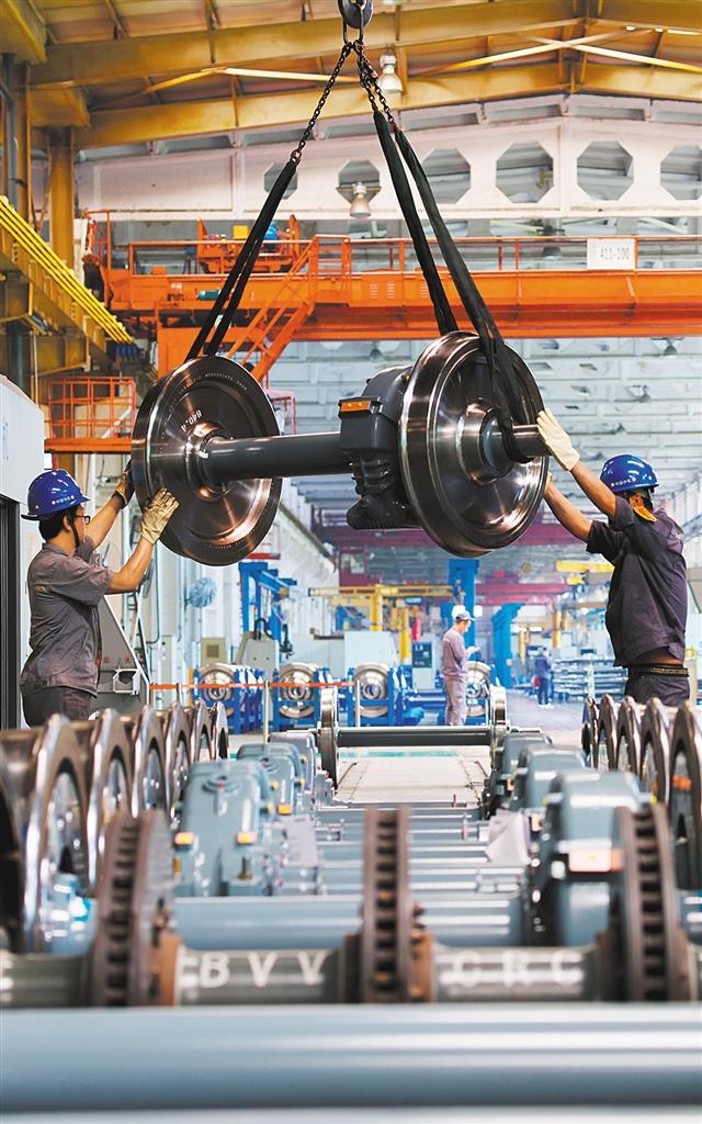 ▼5月28日,中車長客轉向架事業(yè)部總成產(chǎn)線組,員工在進行城軌輪對壓裝作業(yè)。